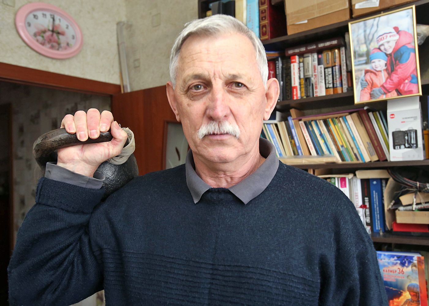 — Вышел на пенсию в прошлом году, хотя вполне ещё 2 — 3 года мог бы работать. И вот чувствую — дома мёрзнуть начал, руки прежде всего. Понял — не хватает движения. Начал делать зарядку, придумал простейший комплекс, и сразу тонус улучшился, а с ним и самочувствие. А хотите расскажу, как я 32-килограммовую гирю домой притащил? Как-то в молодости с женой и дочерью гуляли в центре города, зашли в спорттовары на проспекте Революции, и мне так эта гиря понравилась, что купил её. Думаю: а домой как переть? Потащил к остановке у Дома офицеров, там идти-то метров 200 было. Первые метров десять как-то прошёл, а потом еле-еле ковылял. Но ничего, дошёл и довёз её до дома, вот она до сих пор стоит.