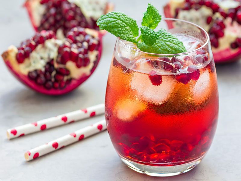 Смешать соки и сироп, добавить газировку. Подавать со льдом, украсить гранатом и мятой.