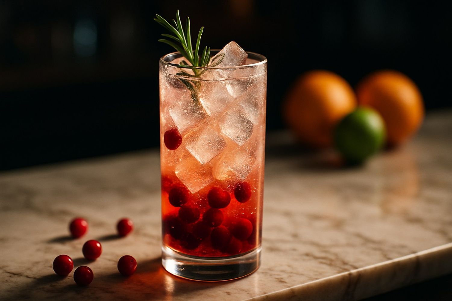 Наполнить бокал льдом, влить соки, долить газировку. Аккуратно перемешать. Украсить веточкой розмарина и ягодами.